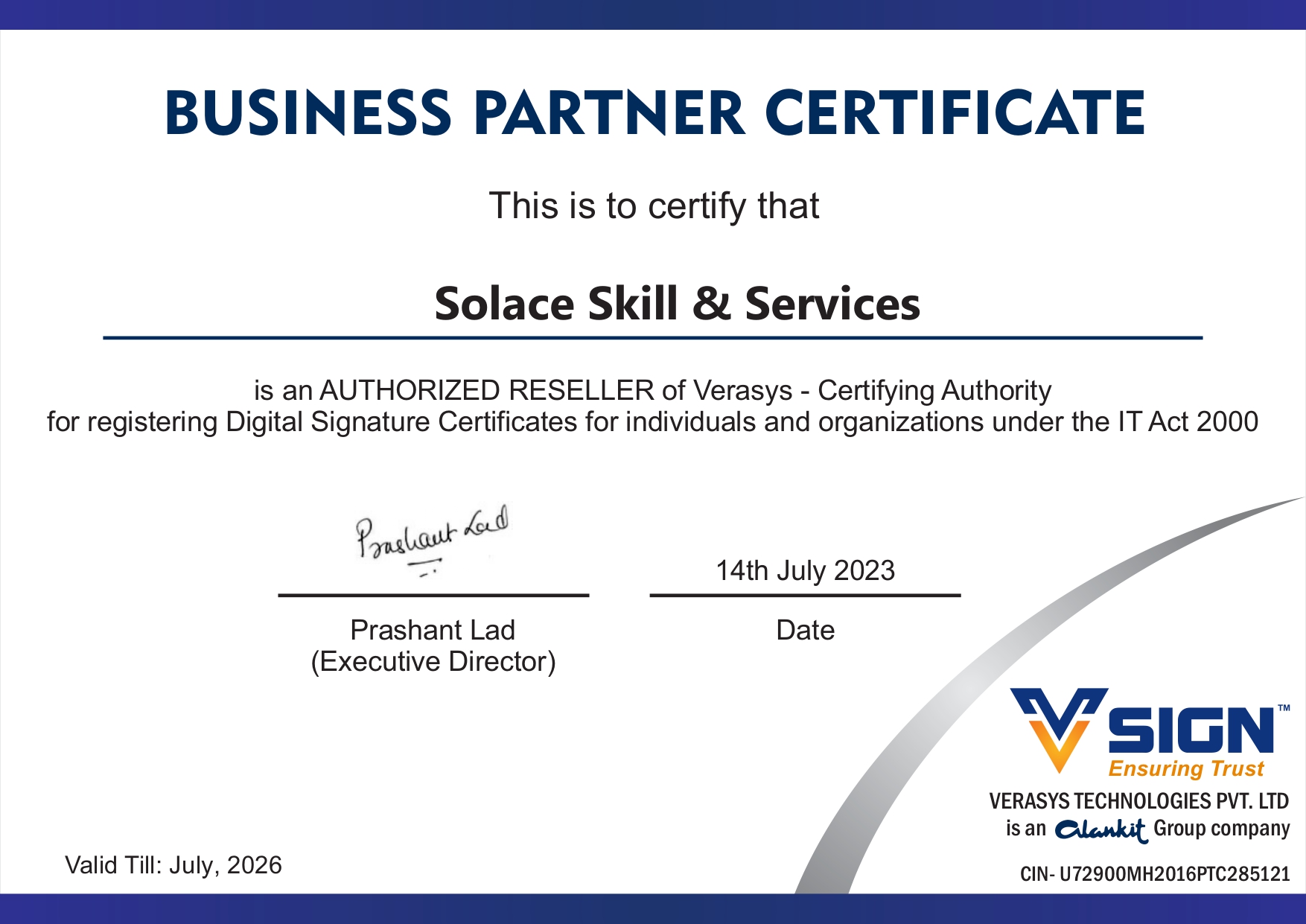 Solace Skill & Services's offers the authentic and secure procedure of digital signature certification. From the registration part to downloading the approved DSC, we ensure to deliver the right guidance and services to our clients.
