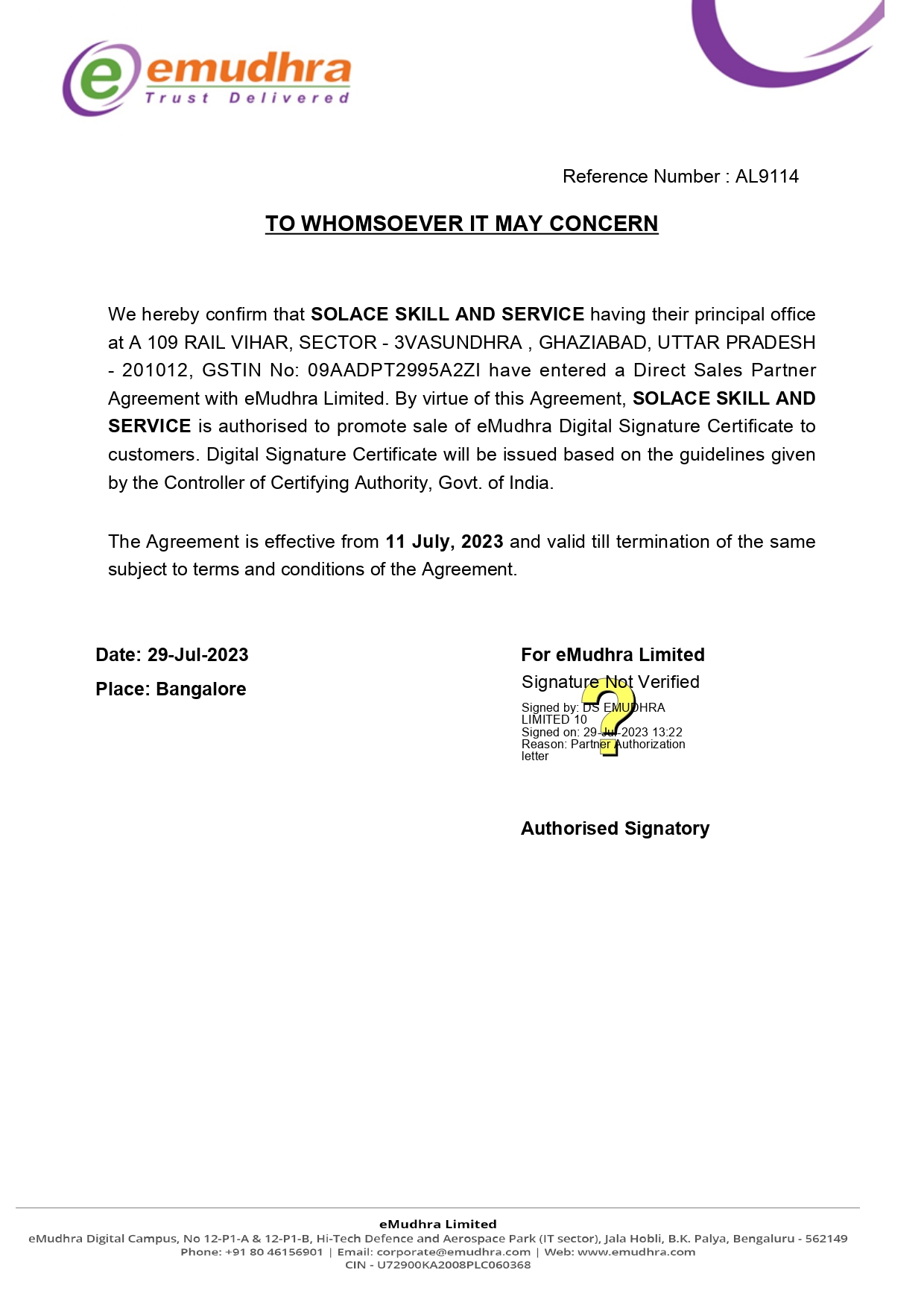 Solace Skill & Services's is well-versed as the most reputed company, offering an authentic digital signature. From trusted and renowned client-based, we have earned immense recognition among our customers
